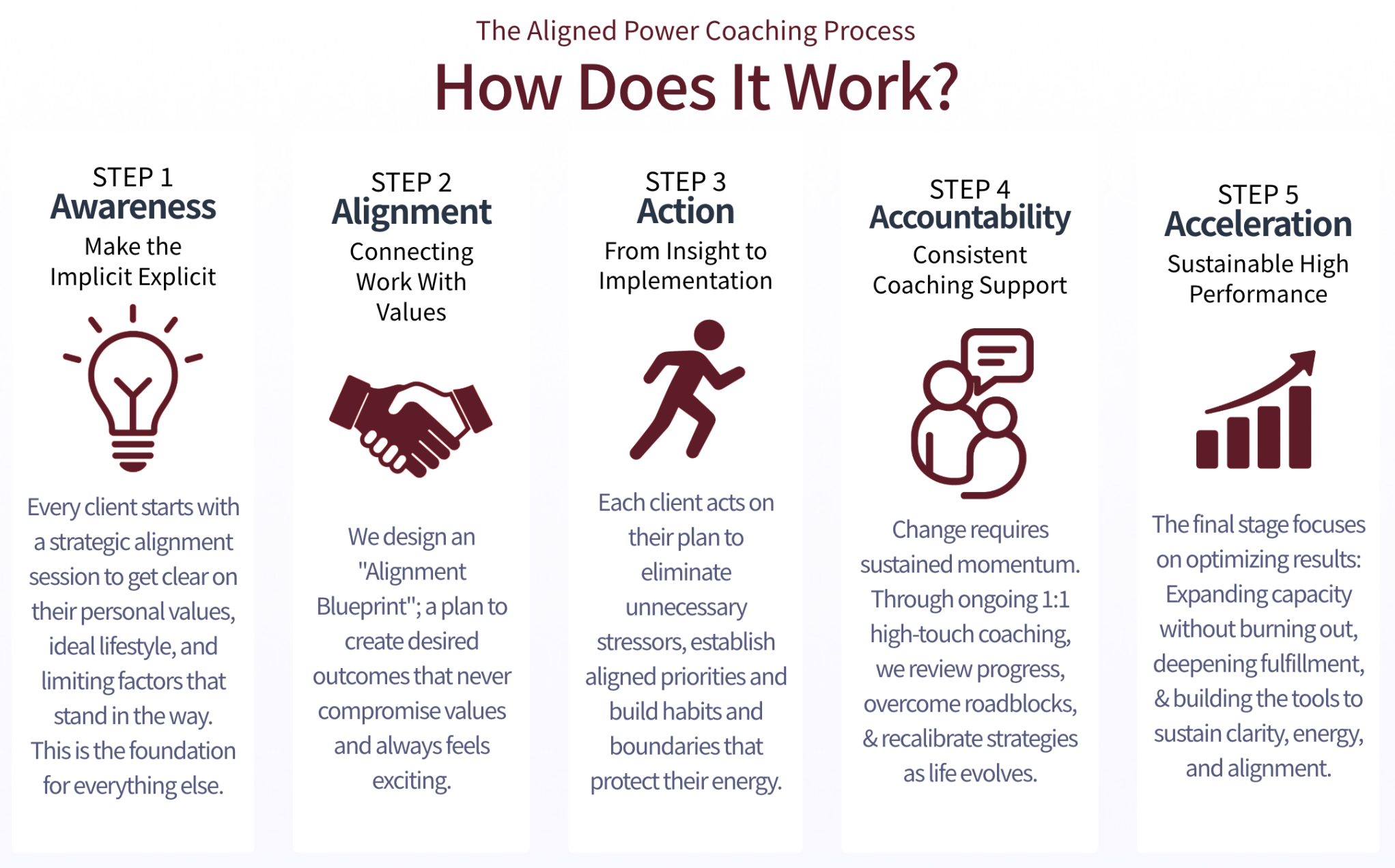 Aligned Powerâ„¢ is a 6 - 12-month, high-touch coaching partnership designed to transform disengaged or distracted professionals into balanced, energized, purpose-driven performers using their own values and goals as fuel!